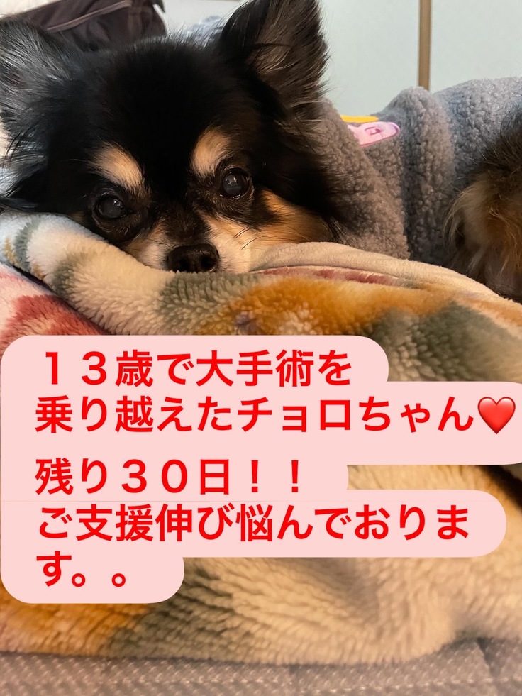 13歳という高齢でありながら、大手術を乗り越えたチョロに対して引き続き医療をかけさせてあげるために可能な限りでのご支援お待ちしております。