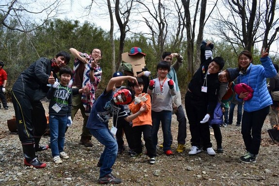 アイスブレイクに登場したキャンプマンとマッチマンと一緒に記念撮影(2014年春キャンプより)