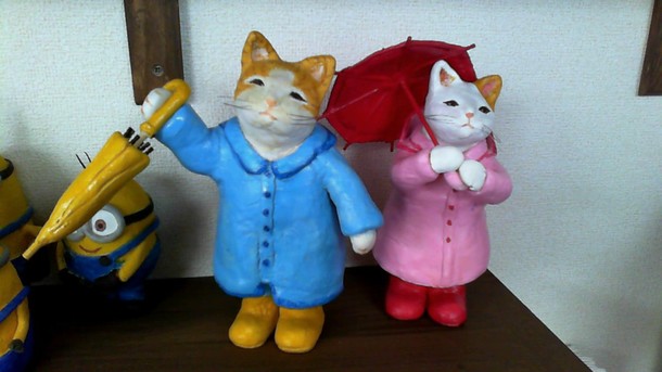 昨日、ボランティアさんが自作の「レインコートを着た猫」を持ち込んで