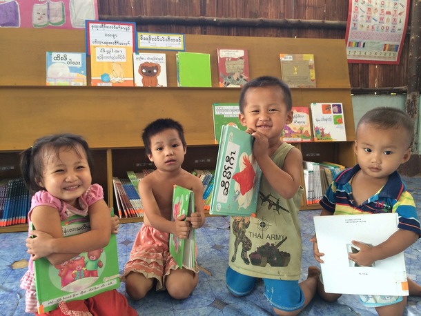 私たちは、毎年、カレン語やビルマ語などの翻訳シールが貼られた絵本を、21館のコミュニティ図書館に届けています。今年は5,600冊の絵本を受け取りました!