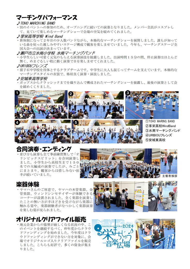 当日(11月2日)は、あいにくの雨天となりましたが、パレードを除く全てのスケジュールが予定通り実施できました。小中高生を中心に11団体450名が参加し、大勢の観客の前で演奏・演技を披露し、栄の街に賑わいを取り戻すことができました。