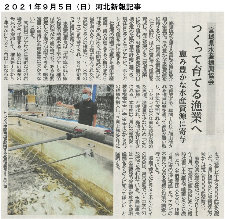 このため、事務所を仙台に移し、他県から提供されたヒラメ稚魚の放流業務のほか、宮城県から受託した復興支援業務を行っていましたが、2015年9月に宮城県七ヶ浜町において新たな種苗生産施設が完成するに及び、同年10月から、稚貝・稚魚生産業務を5年ぶりに再開することができました。現在は、この新たな施設でヒラメやホシガレイの稚魚やアワビの稚貝を生産して、宮城県沿岸の海に放流することで、海の水産資源を豊かにする仕事に取り組んでいます。