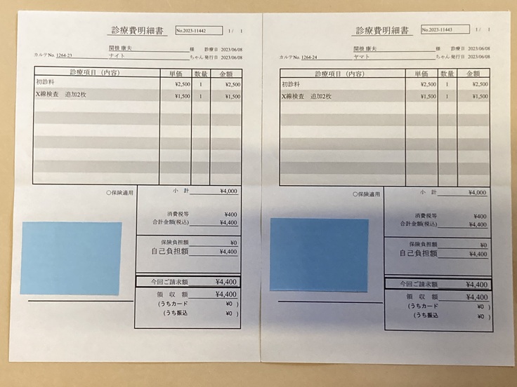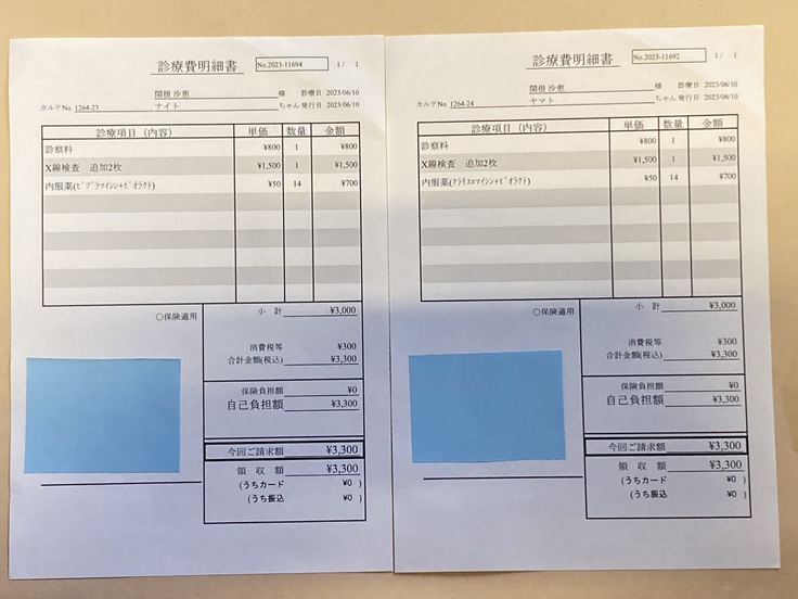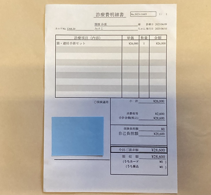 6月5日に無事退院出来ましたが、その後も肺炎と漏斗胸の治療のため通院しております。また6月9日に母猫(みけこ)の避妊手術をしております。今後も通院時には明細書を載せさせていただきます。