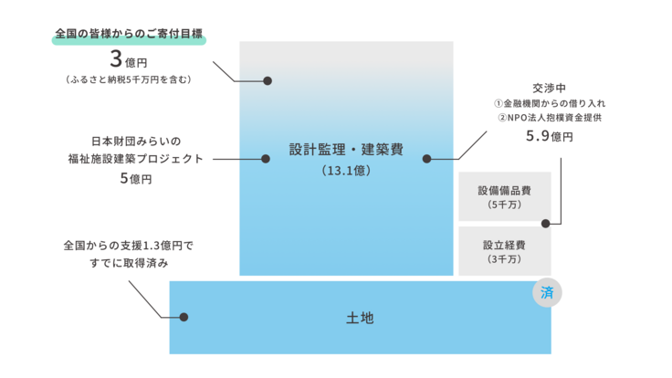 すでにご案内のとおり、当初10億円規模の予算でスタートした本プロジェクトは、物価高騰などの影響で13.9億円に膨らみました。一方で、3億円ほどを見込んでいた国・行政からの補助金ですが、それを超える5億円という日本財団からの助成金が決まるなど、プラスの変化もありました。(※国・行政からの補助金と日本財団の助成金を重複して受けることはできません)。今後、建設着工のためには、審査や入札、契約といったいくつかの手続きが必要となってきます。そこに向かうためにも、まずは寄付キャンペーンの目標金額3億円の達成が必要です。