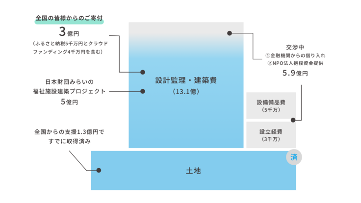 「希望のまち」は、現在このように、総工費・設備費13.9億の準備を助成金とご寄付を中心に進めています。不足分は、金融機関からの融資およびNPO法人抱樸からの資金提供でまかなう計画です。融資は借金になりますので、出来るだけ抑えたく、その意味でご寄付は今も募っております。