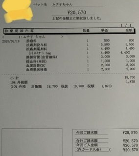 来週は、CHOP5週目なので、詳しい血液検査を行い、腎臓や肝臓の数値に異常がないか確認するため、ここ数週の料金より高くなる予定です。