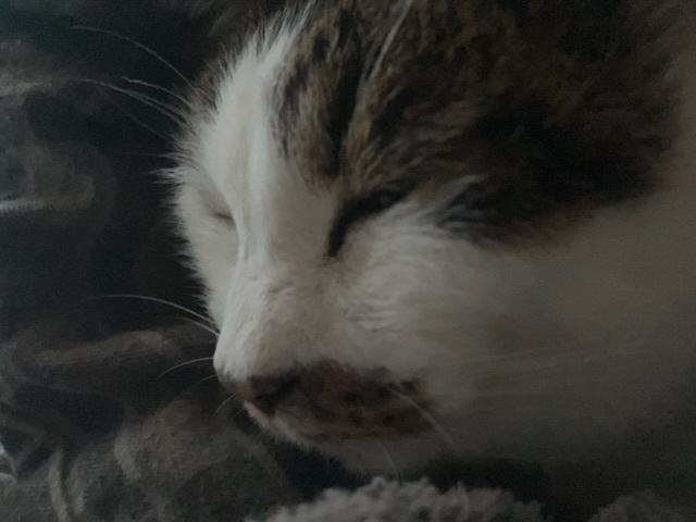 一緒にお布団に。しかし、私がスマホをいじっていると気になる様子。取り敢えずスマホを置いて、腕枕しつつ、ムチ子の方に向き直り、「ママはちゃんとムチ子を見てるよ」と、布団の中で撫でていたところ、完全に寝落ちしていました。