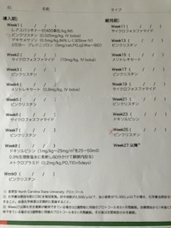 これは、世界中の獣医師が研究して作り上げたもので、反応率90%を誇り、未だこれを超えるプロトコールは出て来ておらず、素人や一獣医がちょっといじった位で、これより良い物が作れるわけはないそうです。それでも改変が行われていない訳ではなく、最初にこのプロトコールが発表された際、4週目と15週目はメソトレキセートではなく、ドキソルビシンだったらしいのです。