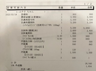 今後の方針を決め、いよいよ抗がん剤の投与です。今回はまた、サイクロフォスファマイド。当初、副作用が出なかった300mg/㎡と、強い副作用が出た360mg/㎡の中間を取って、330mg/㎡での投与を予定していましたが、ムチ子の急激な体重減少により体表面積が縮小したため、300mg/㎡での投与となりました。点滴の時間も、通常より2時間以上多く取って頂きました。