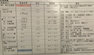 すぐに分かると思うのですが、総白血球数が異常値です。先週は2000でした。どうやら、3週間前のサイクロフォスファマイド投与の骨髄抑制の影響で起きたバクテリアルトランスロケーション(腸内バリア破綻による常在菌の胃への流入での細菌感染)が収束しておらず、強い炎症が起きているようでした。収まらない吐き気もそのせいと見られます。先生は、どこか局所的に腸粘膜が傷付いている場所があるんだろうねと言っていました。
