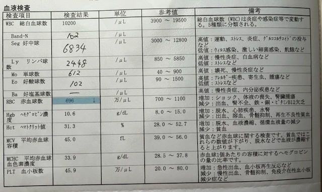 今回の血液検査では画像の通り、総白血球数が正常値まで回復しており、抗がん剤投与OKが出ました。
