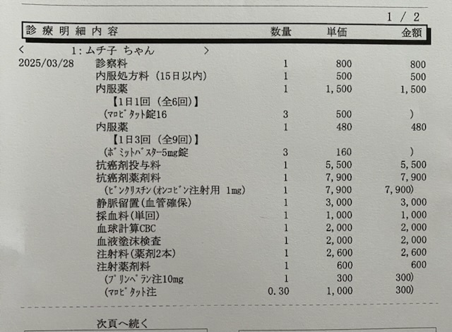 今回はビンクリスチンなので、先生もムチ子の消化器毒性についてはかなり心配して下さり、注射2本+経口薬2種類という、万全の態勢で副作用を乗り越えて行くことになりました。