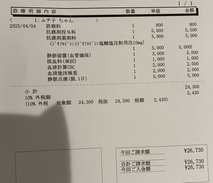 本日はムチ子が早朝から発熱しており、平熱が他の子より低いため(猫にしては珍しい37度台前半で36度後半まで下がることもある)、この熱は相当辛そうです。ドキソルビシンは強い薬なので良く効くそうですが、副作用もかなり強くなりそうな予感がします。これ以上酷くならないことを祈るのみです。