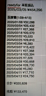 こんばんは。沢山の応援メッセージを頂いているにも関わらず、お返事が滞っており申し訳ありません。来週から新しい抗がん剤治療に入るに当たり、1月28日から4月13日までの医療費をご報告します。詳細は、今までの活動報告に全て明細書を添付しておりますので、そちらをご覧下さい。