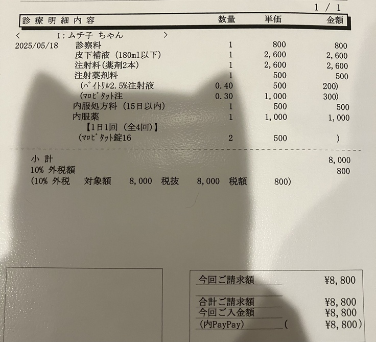 増血ホルモン剤は、骨髄抑制で働かなくなった増血機能に「赤血球を造れ」という命令を出す物で、それを受けて赤血球が造られ始めます。しかし、いくら赤血球を造ろうとしても、造るための栄養が足りていない場合は効果がないらしいです。今のムチ子はかなりの栄養失調状態のため、恐らく効果はないと思われました。薬剤自体も高価で、16000円程でした。ここに諸々含めると、気軽に試せる金額ではありません。