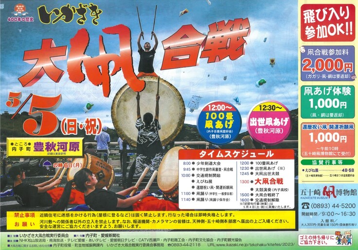 これが今年のチラシです。写っているのは、昨年の大凧合戦で演奏している内子高校郷土芸能部の様子です。この大太鼓が今年も登場します。大太鼓だけでなく、20台以上のいろいろな太鼓や楽器を使って、次々と曲や踊りを披露します。迫力のある曲や、楽しい曲や、艶のある曲を、是非ご堪能ください。お待ちしています。