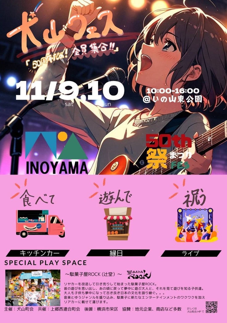 11月9日(土)12:10~13:00、いの山東公園(横浜市栄区)にて犬山フェス「50周年だよ!全員集合!!」に参加させていただきます!前半はジュニアバンド、後半はレギュラーバンドが演奏いたします。