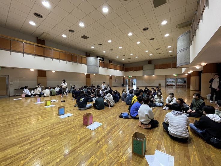 午前は開会式やレクリエーション、班ごとでの自己紹介などを行い、午後から子どもと遊ぶための企画の準備に早速取り掛かりました。どのような企画をしたいか子どものどのような姿が見たいかいちから全員で考え話し合う会議をしました。
