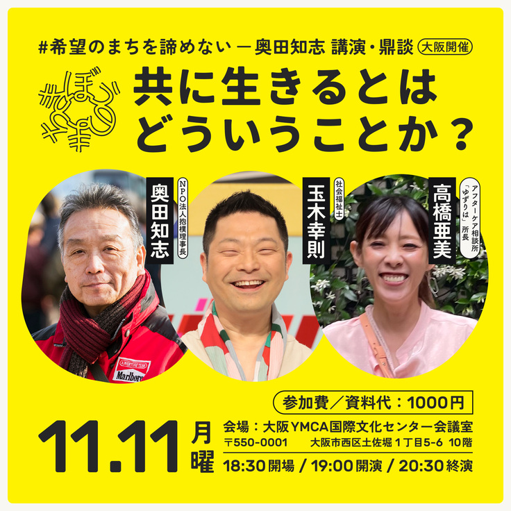 そして11月11日(月)には19:00より大阪市にて、奥田知志による講演と100人応援団の2名を迎えた鼎談を開催いたします。社会福祉士の玉木幸則さん、アフターケア相談所「ゆずりは」所長の高橋亜美さんと共に「共に生きるとはどういうことか?」をテーマに語り合います。
