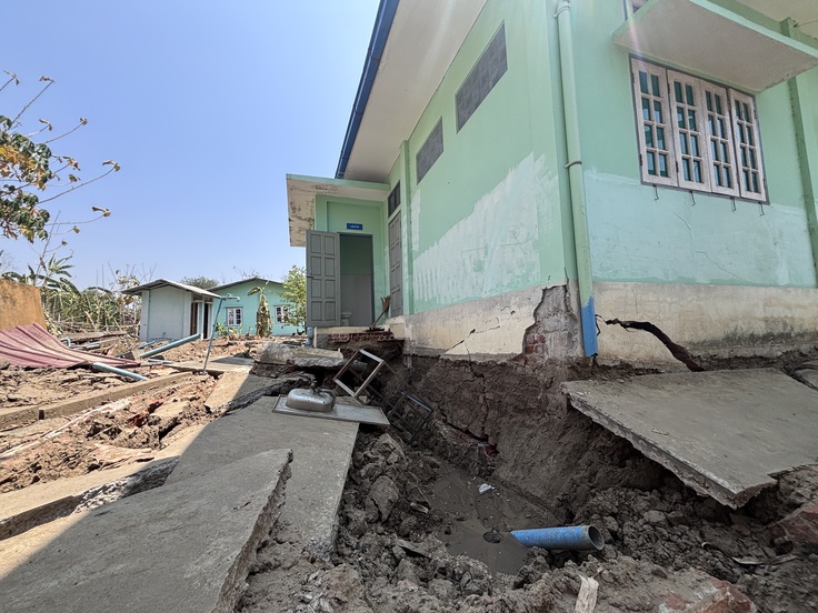 タッコン郡で被害が最も大きい医療施設のひとつであるミャウッメイ地域保健センター(現地からの報告2を参照)。現在も散発的に強い余震が続いており、建物全体がさらに動くと共に、亀裂が広がったり、段差が高くなったり、被害が大きくなっています。そのため、地震発生以来、保健サービスの提供は停止していました。