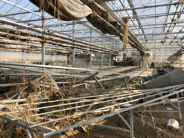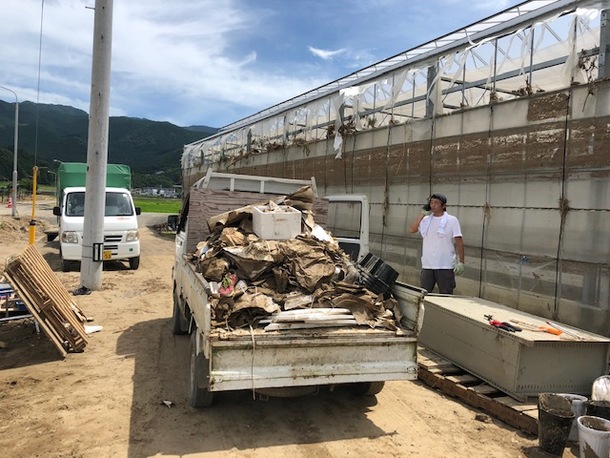 氾濫した肱川の濁流にのみ込まれ、3m80cmの高さまで浸水し、周囲のフィルムや機械設備などが全てダメになってしまいましたが、骨格と屋根部分だけは無事だったのでこれを修復し、早く収入を得る事ができるよう、ミニトマトを生産する施設として再生する事にしました。