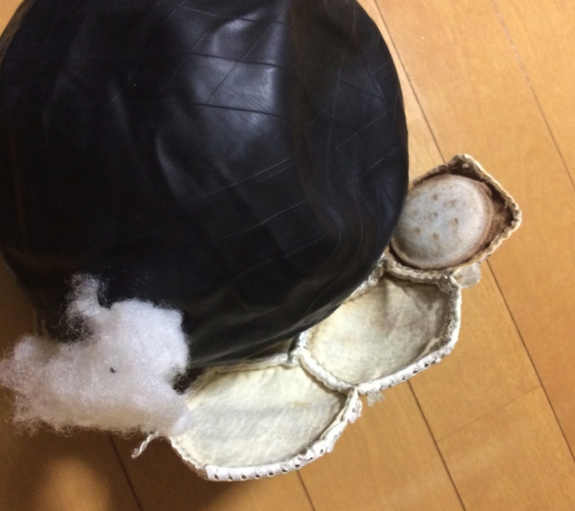 (解体したあとのボールの様子です。表面の革を使ってチャームを作製します。)