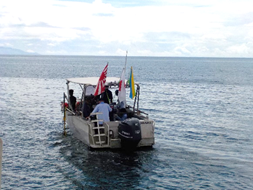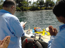 探索前に、調査船の船体には日の丸、旭日旗、ソロモンの国旗の3つの旗を掲揚し、船上の台座にて、靖国神社のお神酒と地元の方からの供花、握り飯を供え、ご支援くださった皆様やご遺族の方々の思いを胸に、英霊の方々の安らかなる眠りをお祈りいたしました。