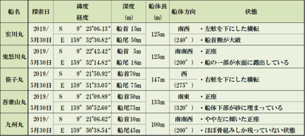 ・探索の結果…サイドスキャンソナーを用いた探索により、下表に示す5隻の位置を特定しました。なお、船名は既存資料から推測した位置との比較や、現地での聞き取りにより特定しました。
