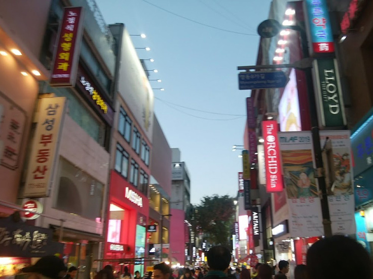 韓国の街並みです。看板はすべてハングル それだけでもドキドキ わくわくしました! 明洞での買い物 楽しかったです!