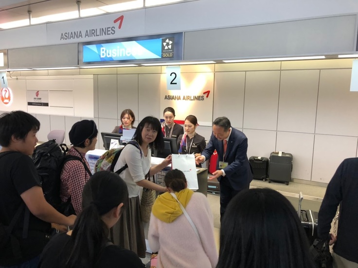 仙台空港での出発の風景 「アシアナ航空」さんから ペンなどのプレゼントをいただきました! 最初からのもてなしに本当にありがたく思いました!