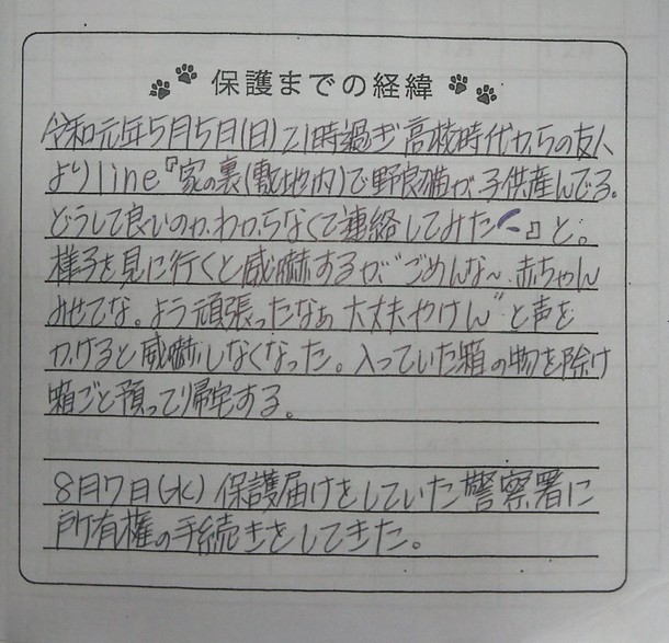 ノミ・ダニもなくお腹に虫もいなかったことを考えると、飼い猫であったのは間違いない。それなのに、知らない家の物置でひとり4匹の仔猫を出産したあやめ。この仔に何があったのか・・・