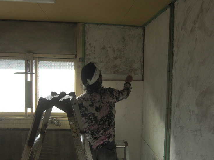 13日、昔の田んぼ仲間だった龍ちゃんと二ちゃんが手伝いに来てくれました。二ちゃんは子どもを二人連れ、更に土鍋持参で鍋を振舞ってくれました。とてもおいしかったです。ご馳走様でした。今日の作業は、漆喰とペンキ塗りをやりました。漆喰は下塗りをやったのですが、始めはムラ無く塗るのが難しかったです。でも終わりがけには、まあまあうまく塗れるようになりました。特に龍ちゃんが下手くそでした。でも本人はビールを飲みながらとても楽しそうにひとりでしゃべっていました。よかったね!龍ちゃん!