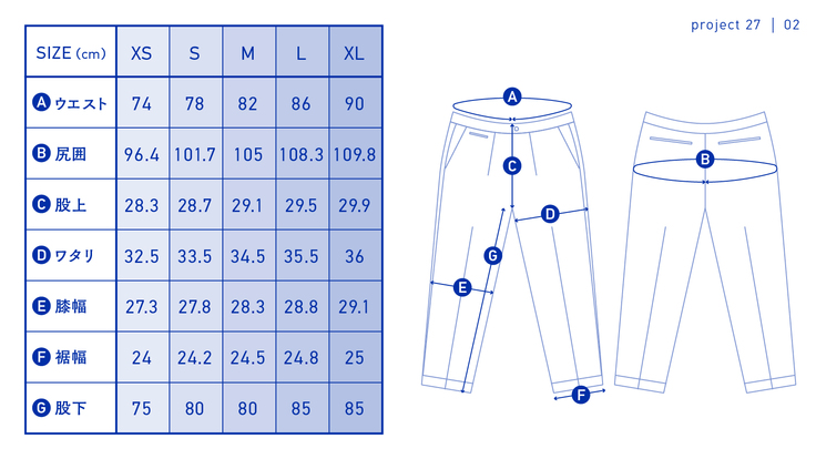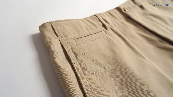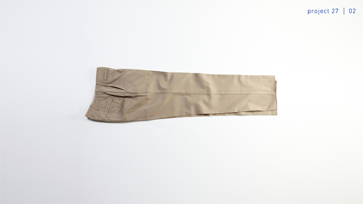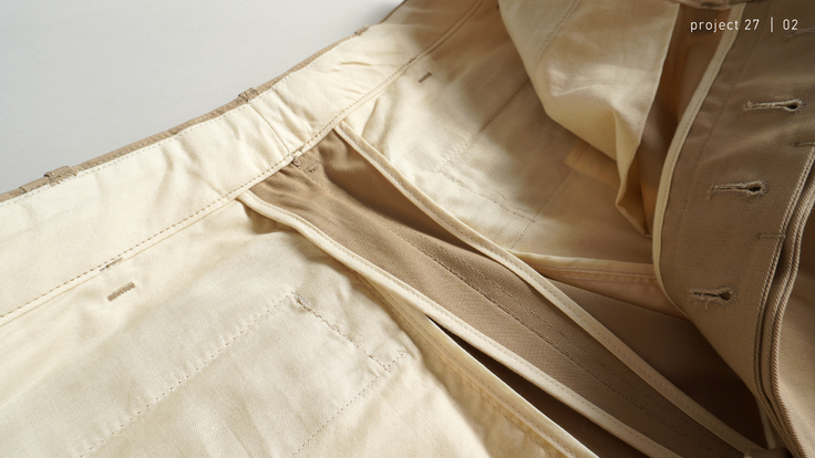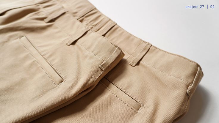 19世紀に軍隊の制服として生まれたチノパンは、「チノクロス」と呼ばれる頑強なコットンツイル生地で作られたパンツを指します。誕生から長い年月を経て、現在ではジーンズに並ぶ街着の定番品として世界中でボーダレスに愛されています。このベーシックアイテムをもとに、私たち『27』はチノパンの縫製と素材を一から見直し再構築しました。
