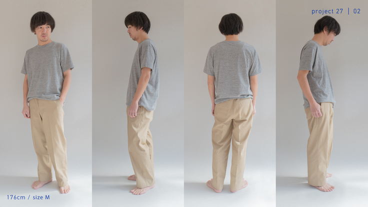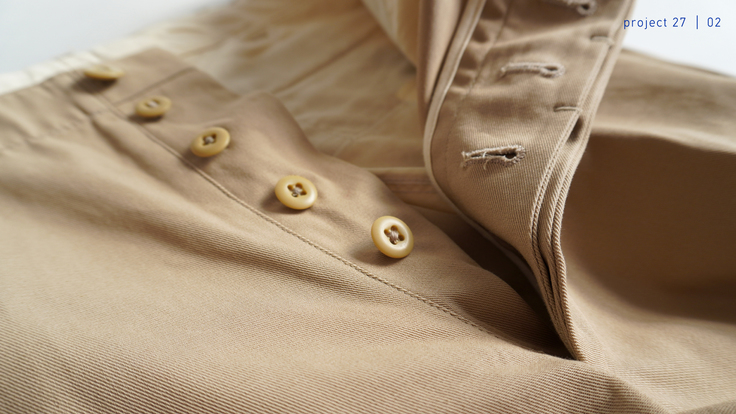 <27-01>に続き、私たちが提案する<27-02>は「チノパン」です。ミリタリーウェアをルーツに持つこのアイテムも、今や世界中で愛用されている街着の定番品となっています。多くの人が一度は履いたことのあるこの見慣れたアイテムを、私たち『27』の視点で最高の一本に仕上げたいと考えています。