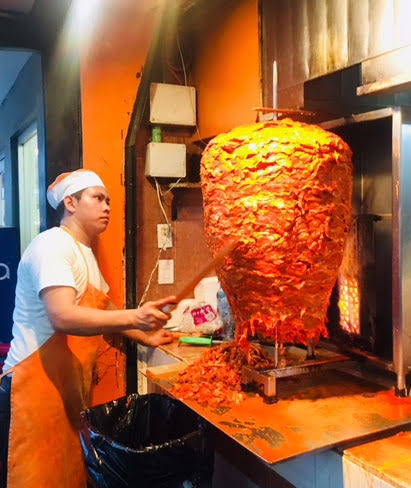 パストールには豚肉が使われ、パクチー、玉ねぎ、パイナップルが降りかかっています!