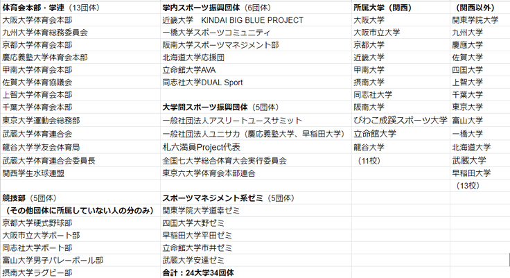 議論は尽きませんでしたが、参加者一人一人が、これまで想像したこともなかった仲間との遭遇を喜び、今後も大学・地域・競技を超えたつながりを維持していきたい!そして、ここから仲間の輪を広げていきたい!という思いは皆さん一致したと思います。