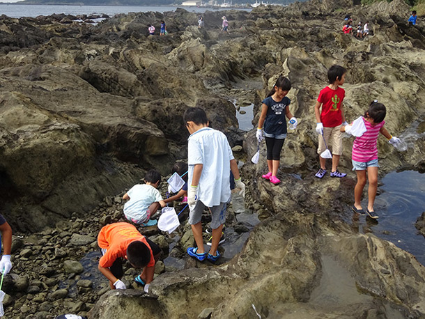 ある学校で磯観察が行われました。皆、軍手を付け、手持ちの網を持って潮だまりに生息している生きものを探しています。この後小さい水槽に入れ、観察していました。