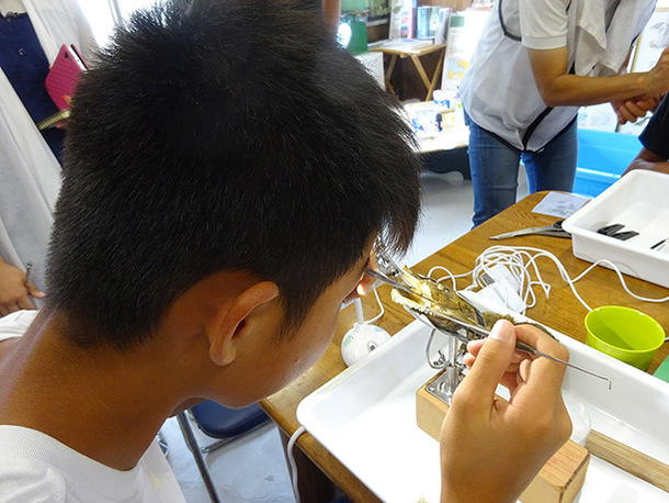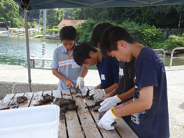 ある中学校では、地元のNPO団体の協力で真珠の元となる貝の掃除を体験していました。