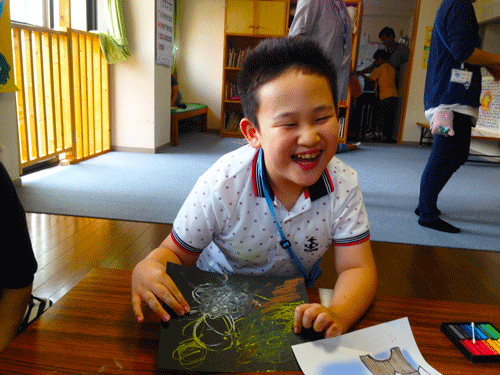 かずまくんは生まれつき脳性麻痺で首から下を自由に動かすことが困難でした。はじめは、どうしたらかずまくんが楽しく絵の活動に参加できるかを考えていましたが、かずまくんの方から「先生!ぼくは色を感じることができるよ!」と話しかけてくれました。もともと人と話すことが大好きだったかずまくん、「ぼくのお医者さんが右手と左手をたくさん使うとリハビリになるって言ってた!」と言いながら、どんな絵や工作にも一所懸命取り組み参加してくれました。