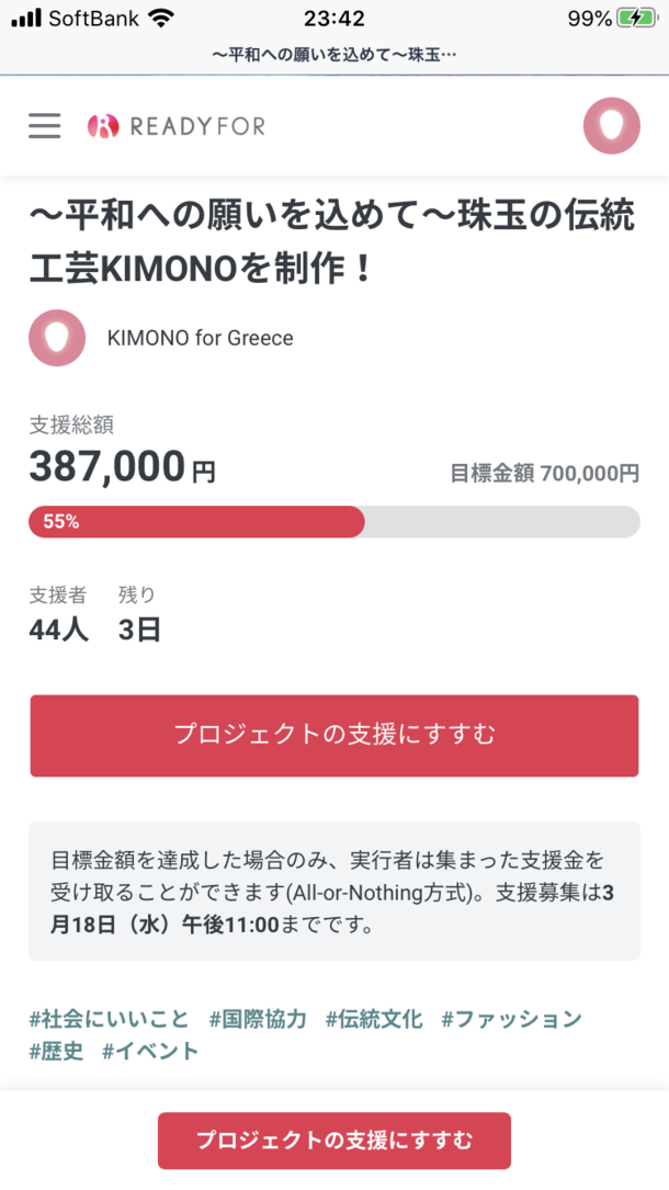 本当にギリシャKIMONOクラファンの応援をいつもありがとうございます、数日前までは、3割未満だったのに、今日で半分いきました!