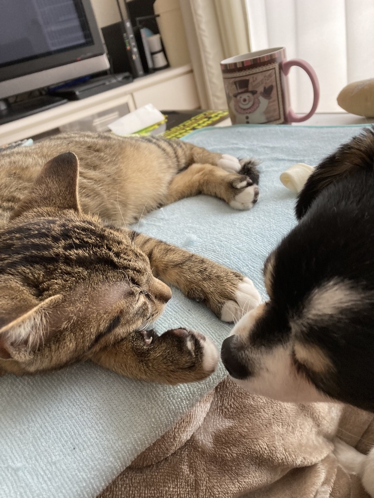 診察後3日目となりました。ステロイド3/4の量でも食欲、排便ともに安定しております。寝ていることは多いですが、時々他の猫たちが恋しくなるようです。しかし、猫白血病の可能性も濃厚なので接触には細心の注意をしています。基本的に隔離をしていますが、時々犬の豪ちゃんに遊んでもらっています。(猫白血病は犬や人には感染しません)