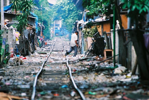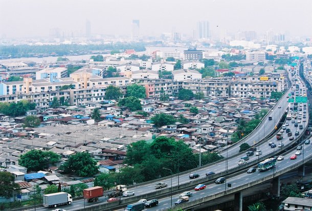 しかし、その高速道路の下に目をやると、スラムを見ることができます。