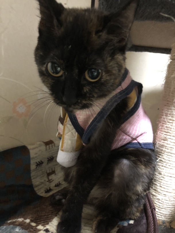 サビィちゃんが包帯カミカミして取っちゃうので、お洋服作って着せてみました。これで前より包帯取れないようになるといいな。