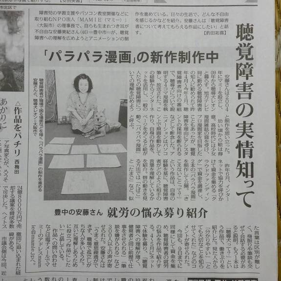 昨年6月、インターネット上で協力を呼びかけて資金を集める「クラウドファンディング」を利用し、2本の「パラパラ漫画」を制作して公開。うち「きこえないということ」という作品は、自身の経験を基に聴覚障害者がどのようにして、相手の言葉を理解しているかを紹介。唇の動きを見る方法では「たばこ」と「たまご」など、音節が似ている言葉は区別が難しく、身振りや筆談も交ぜて会話する必要があることを説明。もう一つの「聴導犬って?」という作品は、携帯電話の着信音や背後から迫る自転車の音などを使用者に伝える働きぶりを紹介した。サイトには「とても大切なことを知らせてくれた」など、コメントが寄せられた。