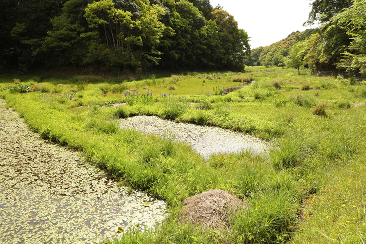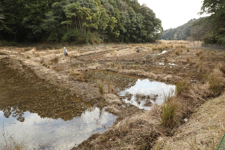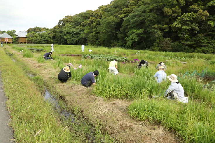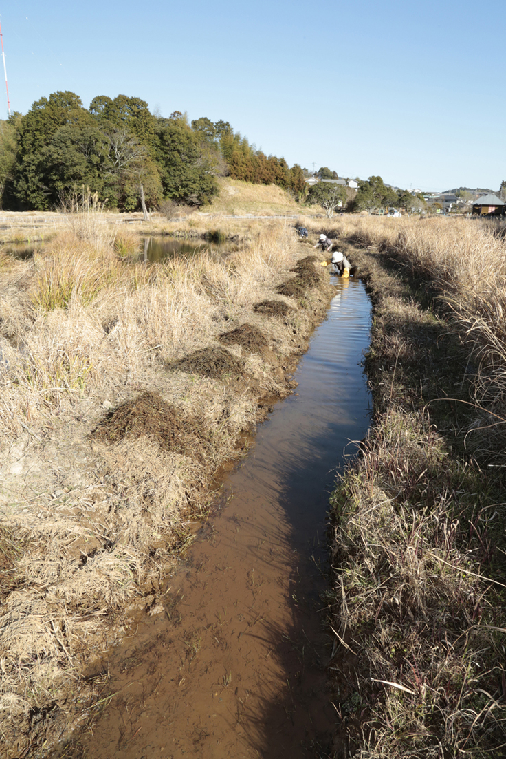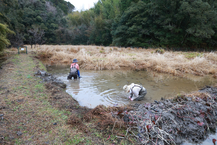 年4~5回の除草と渇水時の給水、日照確保の雑木伐採などを行っています。落ち葉の堆積で水深が浅くなった場所は、一旦表土を植栽ごと剥ぎ取って直下の田泥を除去、再び表土を元の場所に戻すという、一寸手の込んだ作業も行っています。