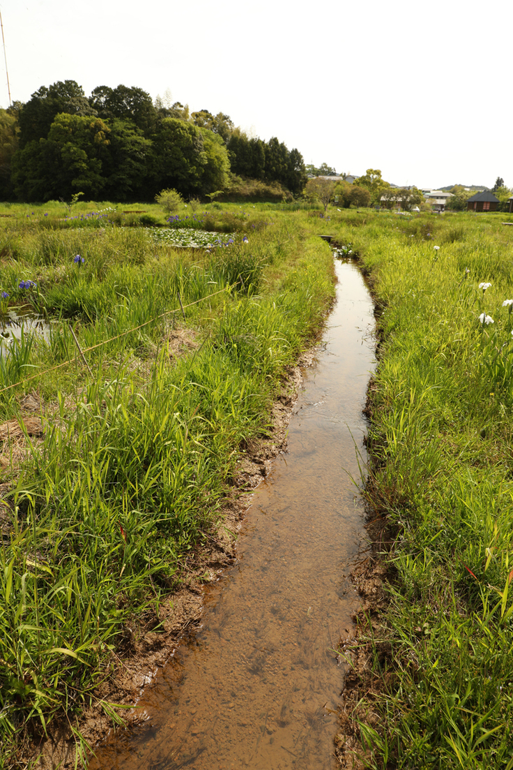 セスジイトトンボやキイロサナエなどが生息しています。早春には岸辺にスミレやレンゲ(ゲンゲ)が咲き、唱歌「春の小川」さながらの風景が広がります。 以前は農家による共同管理でしたが、放置田の増加で作業の大半をトンボと自然を考える会が受け持つようになってしまいました。年5~6回の土手除草と、冬期の川ざらえ、ハナショウブ池を結ぶ小橋の管理などが主な作業です。