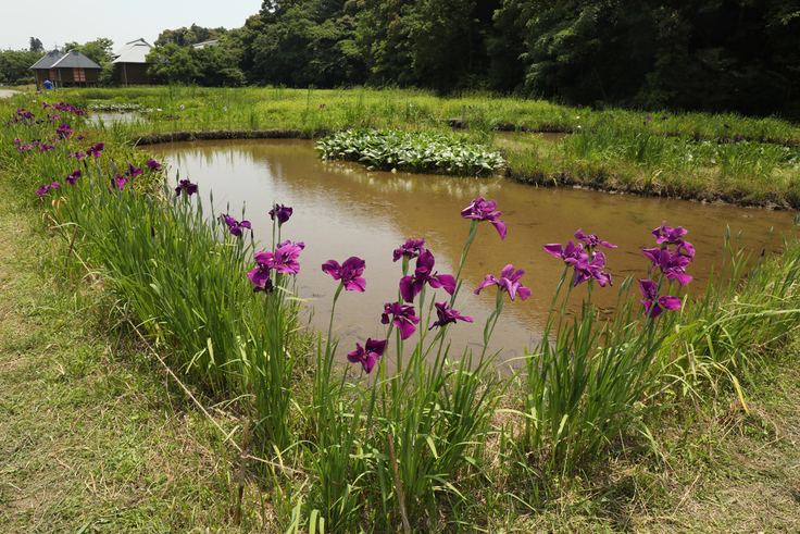 周囲にハナショウブを密生させたトンボ池です。ここはウチワヤンマなどが好む水面の開けた水辺ですが、夏期には繁茂したハナショウブの葉々が乾燥を嫌うイトトンボ類のシェルターになります。本エリアの主な管理作業は早春の株分け、カマによるススキやイグサ等の除草や防獣柵補修、洪水後の丸木橋補修などです。