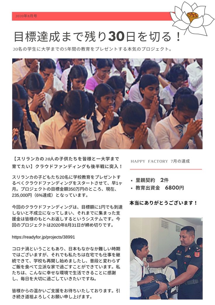 スリランカ教育支援のクラウドファンディングが今月末、8月31日を持って終了します。