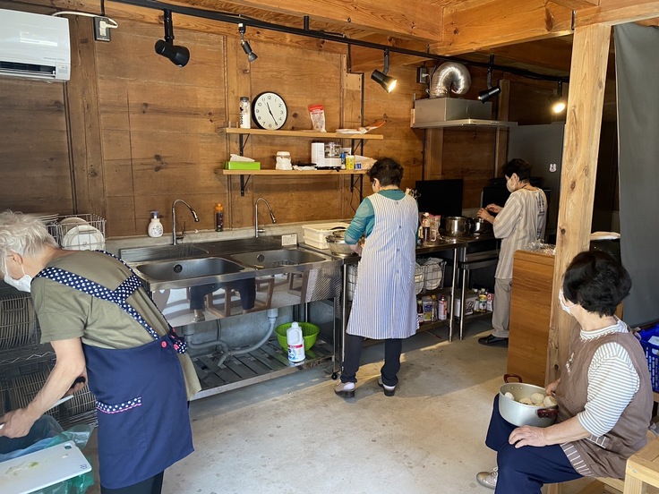 側溝清掃が一息ついたところで、婦人会の方々がアーバンデザインセンター坂井の施設「くららぼん」にて昼食の準備が始まりました。事前に何度も打ち合わせて企画した弁当を区民の皆さんに振舞っていただきました。おいしいお弁当をありがとうございました。