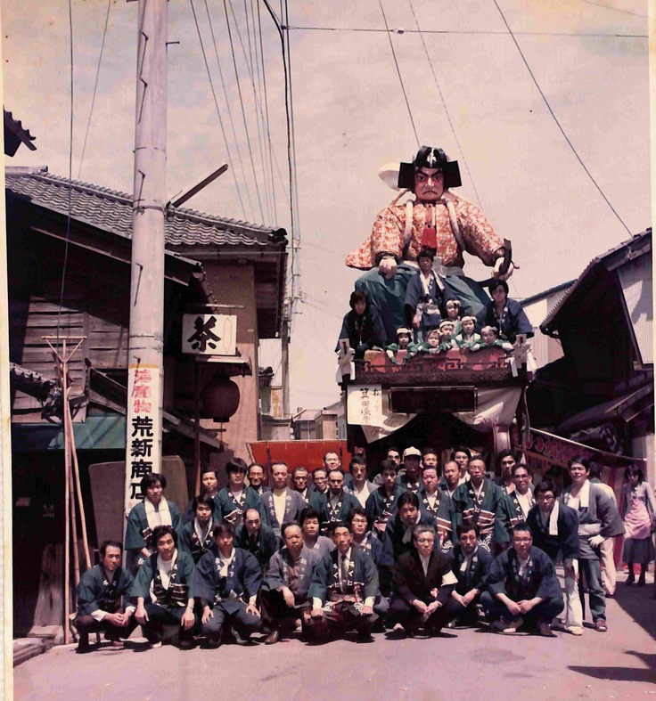 こちらの山車には、歌舞伎十八番象引「豊島館の場」から「箕田 源二猛」が選ばれています。暴れた象をおとなしくさせるという話です。この年から写真がカラーとなり、区の方々の表情や山車の様子が少し打つ鮮明に記録されるようになりました。左奥には、現在では駐車場となっている森田倉庫の建物が写っています。